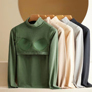 The FleeceFlex High Neck Built-In Bra Tee is your go-to winter essential, combining a snug fleece finish with a sleek high neckline. The built-in bra provides effortless support, while the insulating fabric keeps you comfortably warm on chilly days. Designed for a streamlined fit, this tee works perfectly on its own or as a layering piece under jackets and coats, giving you warmth without bulk.