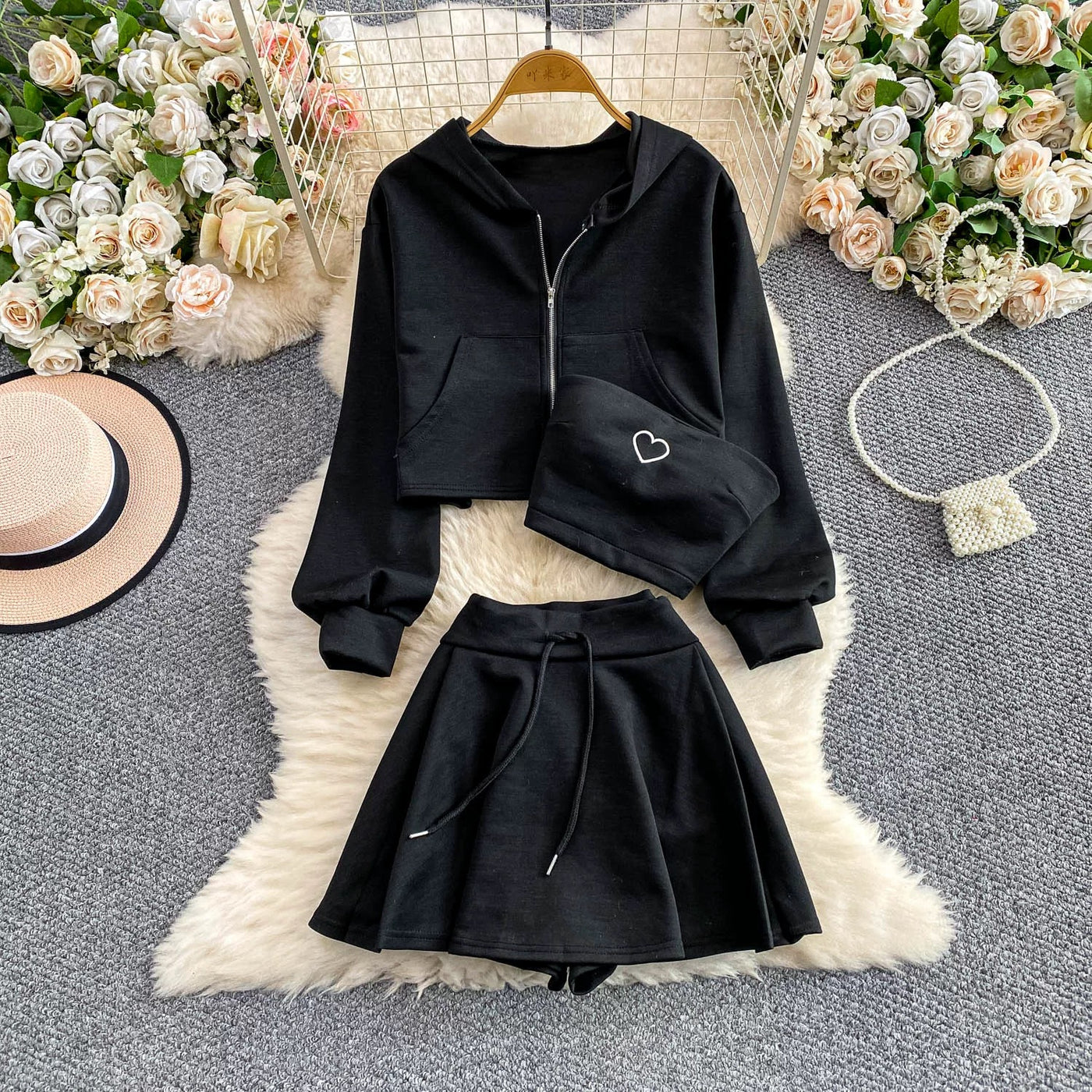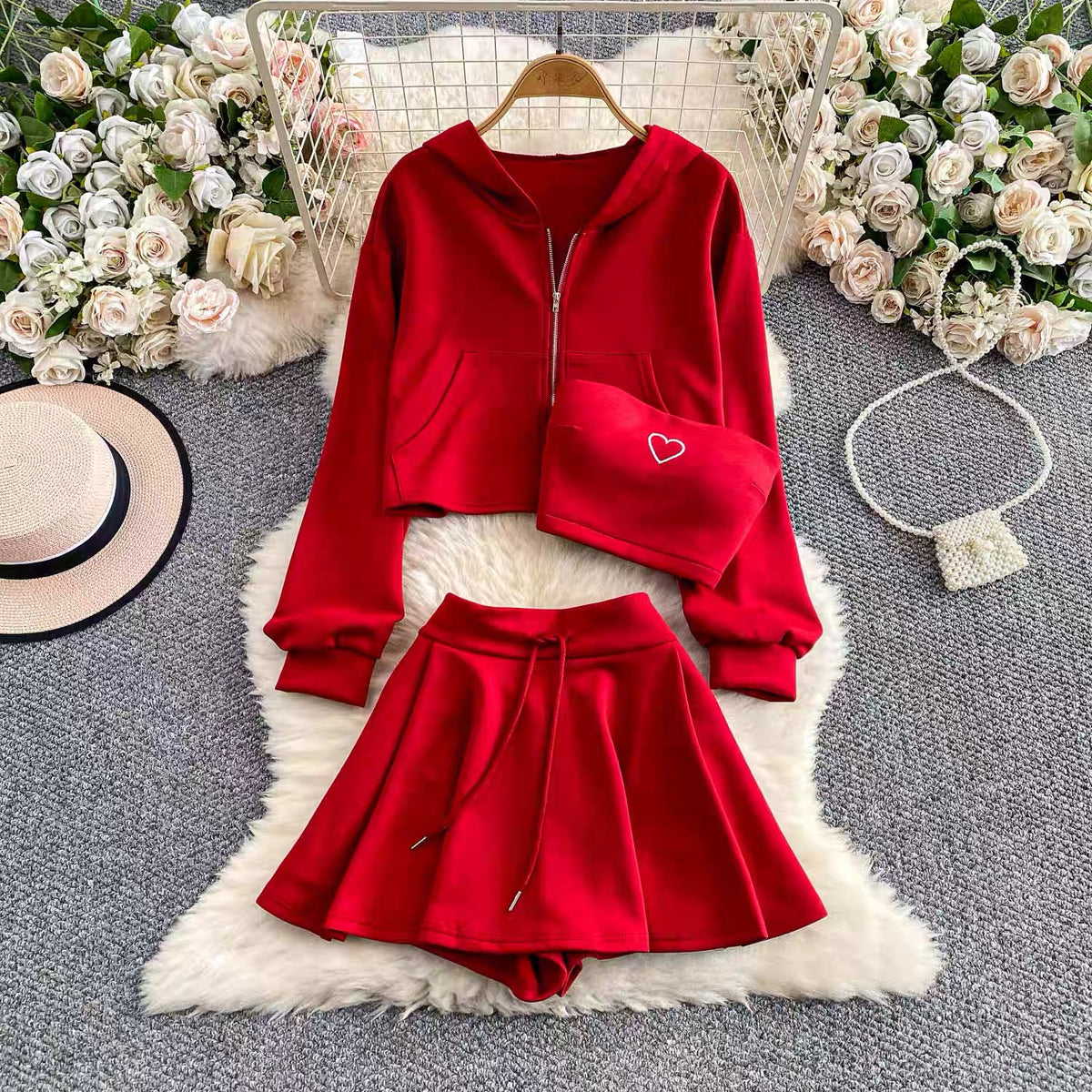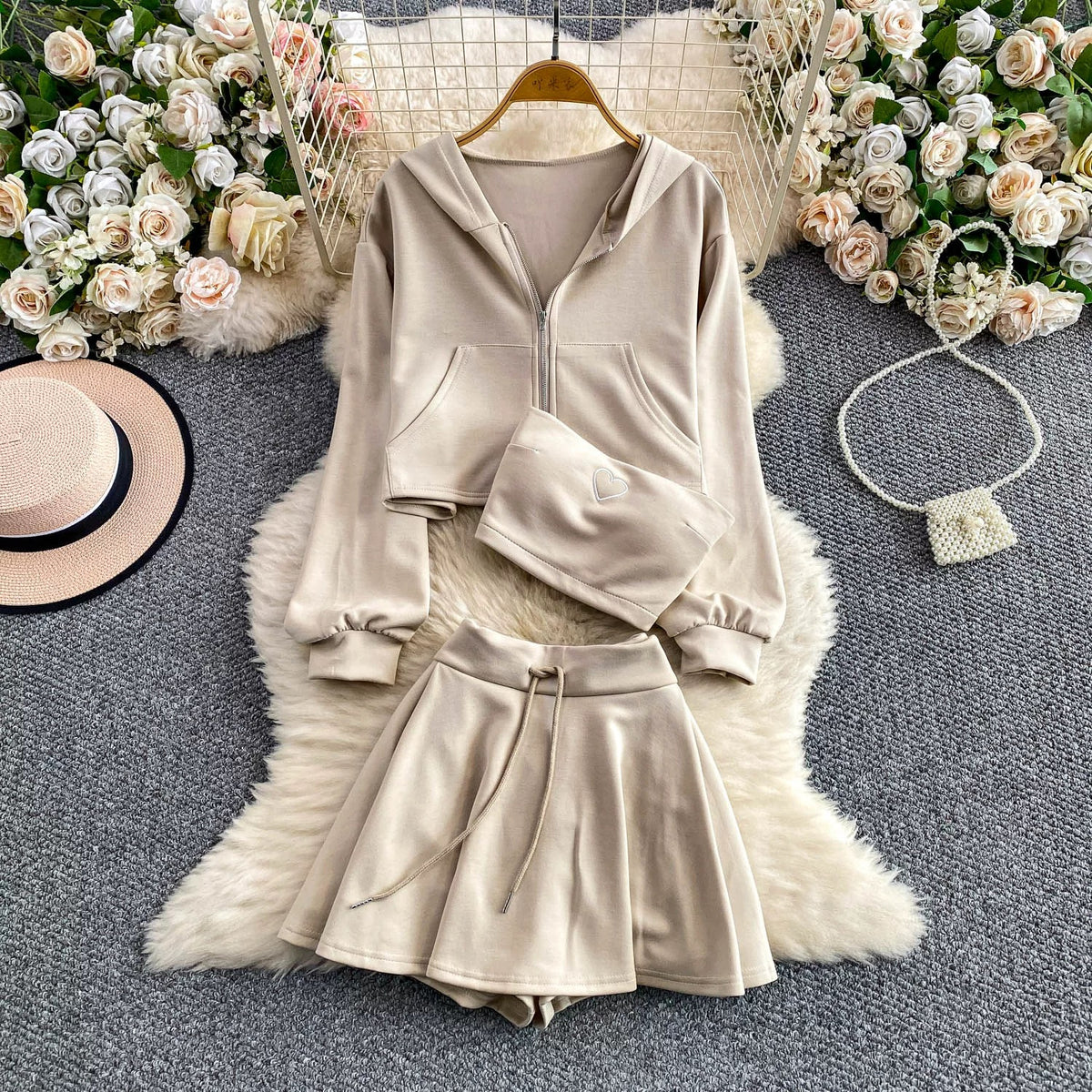 Turn heads with the chic Street Luxe Padded Co-ord Set, designed for effortless style and all-day comfort. This 3-piece set includes a trendy cropped hoodie, a padded bandeau with a cute heart detail, and a high-waist flared mini skirt with attached shorts for ease and confidence. Perfect for casual outings, travel, or a laid-back streetwear vibe, this co-ord set blends comfort with luxury. Made from soft, breathable fabric, it gives you a flattering fit while keeping you stylishly comfortable. Pair it with sneakers or boots for the ultimate statement look.
