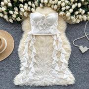 Discover the perfect blend of elegance and charm with our strapless floral lace ruffle crop top. Designed with a flattering sweetheart neckline and a chic rose detail, this top is ideal for special occasions, summer outings, or parties. The cascading ruffle tassels add a whimsical, eye-catching touch, while the soft floral lace fabric ensures comfort and style.