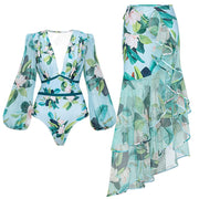Make a bold statement this summer with this stunning floral swimsuit and matching cover-up skirt set. The one-piece swimsuit features a plunging V-neck design with elegant puffed long sleeves and a cinched waist for a flattering silhouette.