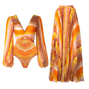 Turn heads with this stunning ombre monokini and matching pleated skirt set, perfect for luxurious beach days, tropical vacations, and poolside glamour. The vibrant sunset-inspired hues and flowy pleated fabric create an effortlessly chic and elegant look.