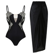 Make a bold fashion statement with the Rose Embellished Monokini with Skirt, a stunning blend of glamour and sophistication. This black monokini features delicate rhinestone rose embellishments, adding a touch of elegance and sparkle.