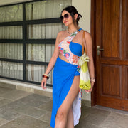 This vibrant two-piece swimwear set features a stunning monokini with an asymmetric one-shoulder design, combining bold floral and geometric prints with a solid bright blue for a chic and flattering look. .