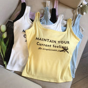 Express yourself in comfort with our "Maintain Your Current Feelings" Built-In Bra Top. This stylish and supportive camisole features a seamless ribbed knit fabric and a built-in shelf bra for a flattering, secure fit. The empowering graphic print adds a touch of personality, while the square neckline offers a modern look. Perfect for layering or wearing on its own, this versatile top is a wardrobe essential. Available in a variety of colors to match your mood and style.
