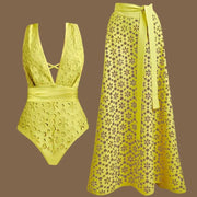 Fresh as a marigold, the Genda Phool set features a floral cutwork monokini with a plunging neckline and a matching wrap-around skirt. Radiating festive charm and elegance, this vibrant yellow set is perfect for sunny vacations, beach parties.