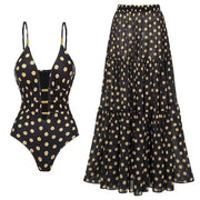Make a statement in the Chandni Raata Monokini & Skirt Set, featuring a deep plunge neckline and elegant gold polka dots. This versatile black swimsuit pairs perfectly with a flowy tiered maxi skirt for effortless beach-to-brunch style. Glamorous, bold, and made for tropical escapes.
