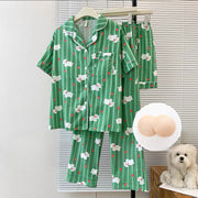 Featuring a playful puppy print on soothing green stripes, this cute and comfy set includes a button-down top, relaxed shorts, and full-length pants. Comes with built-in  pads for effortless support. Ideal for lounging, sleeping, or just relaxing at home in adorable style.