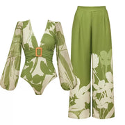 Fresh and serene like a cup of green tea, the Matcha set features a belted monokini with billowy sleeves paired with wide-leg floral pants. This elegant olive-toned outfit is perfect for resort escapes, poolside brunches, or sunset getaways.