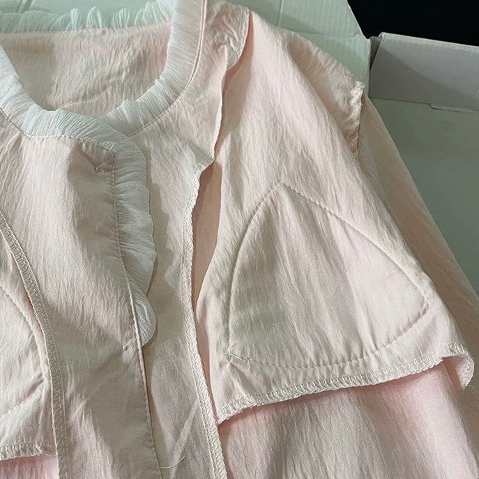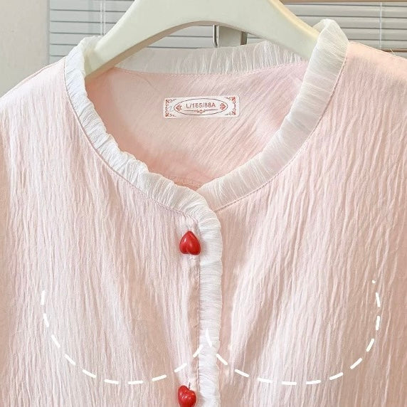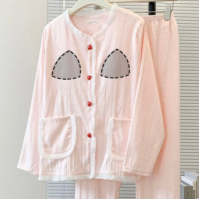 Unwind in pure softness with this pastel-toned nightsuit crafted from lightweight, breathable cotton. Designed with cozy long sleeves, contrast buttons, and a relaxed fit, it features built-in bra padding for gentle support. Perfect for lounging or bedtime, this set brings effortless comfort and minimal elegance to your nightly routine.
