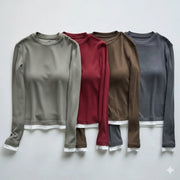 Stay effortlessly stylish and cozy with the Layer Luxe Warm Built-In Bra Tee. Featuring long sleeves with chic layered detailing at the cuffs and hem, this tee combines modern design with everyday comfort. Crafted with soft, insulating fabric and an integrated bra for support, it eliminates the need for extra layers. Perfect for casual outings, lounging, or layering in cooler weather, it’s your go-to wardrobe essential for warmth and ease.
