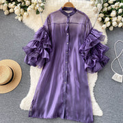 Make a statement with our Cascading Ruffle Sleeves Shirt Dress – where elegance meets modern flair. Featuring dramatic layered ruffle sleeves and a classic button-down silhouette, this dress is perfect for brunch, events, or a chic office look. Style it with heels or boots for effortless sophistication. A must-have piece for your fashion-forward wardrobe.