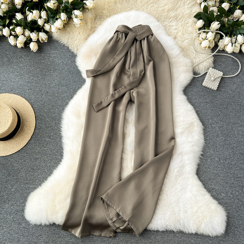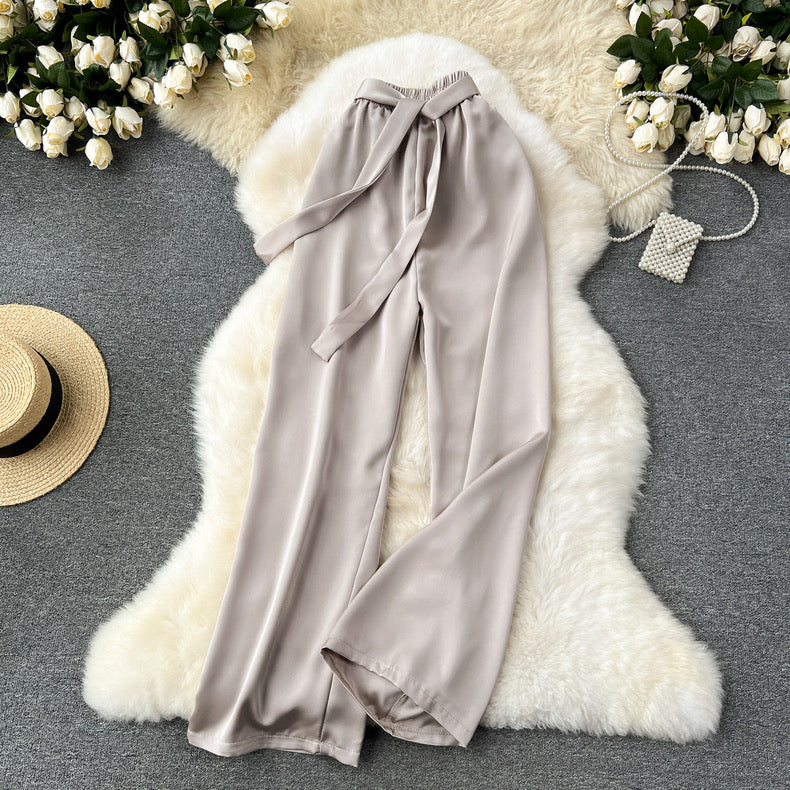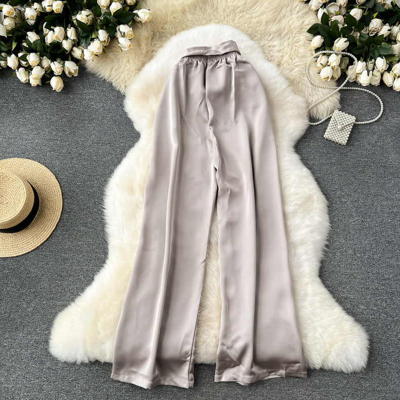 Discover the epitome of sophistication with our collection of high-waisted satin trousers. Available in a range of elegant neutral tones, these trousers feature a comfortable elastic waistband and a chic tie belt for added style. Perfect for both formal occasions and stylish everyday wear, these satin trousers are designed to provide a luxurious and flattering fit.