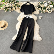 Elevate your style with our sleek black two-piece set, featuring a cropped short-sleeve top and high-waisted wide-leg pants. The contrasting white waistband with a drawstring adds a chic touch, making this ensemble perfect for both casual outings and more dressed-up occasions. Stay comfortable and stylish with this versatile and modern outfit.