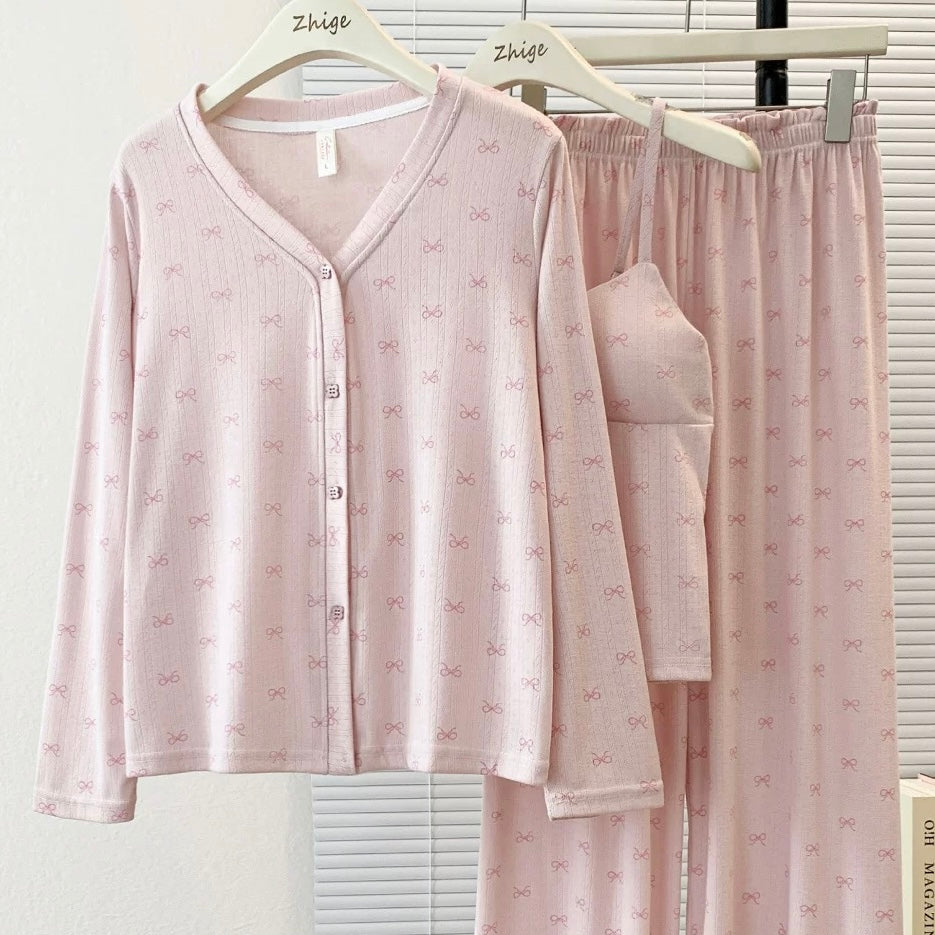 Cloudkiss Bow Padded Nightsuit - 3Pc Set - Pink / M