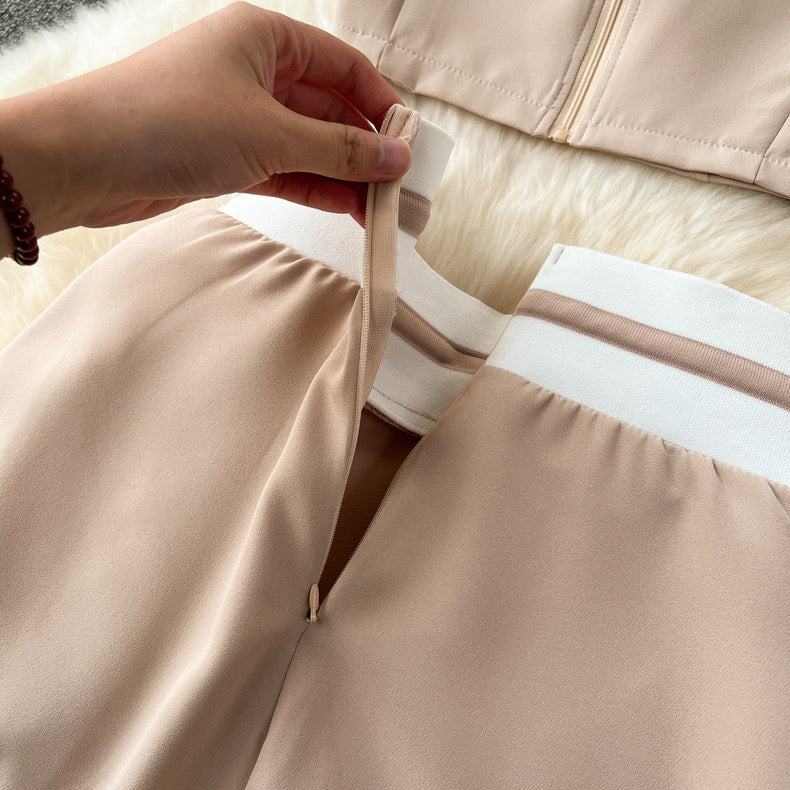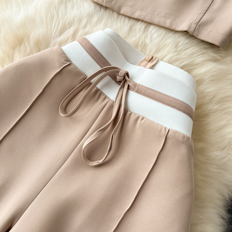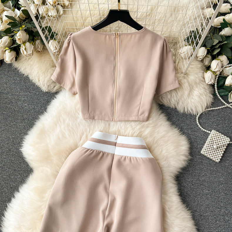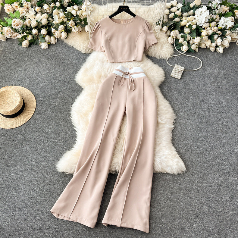 Elevate your style with our sleek black two-piece set, featuring a cropped short-sleeve top and high-waisted wide-leg pants. The contrasting white waistband with a drawstring adds a chic touch, making this ensemble perfect for both casual outings and more dressed-up occasions. Stay comfortable and stylish with this versatile and modern outfit.