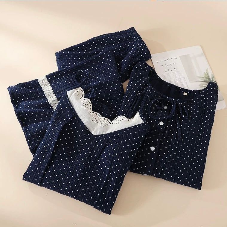 Navy Polka Dot Padded Nightsuit- 3pc Set - Dark Blue / L